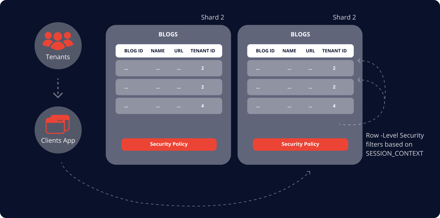 The point is that the elastic database client library data-dependent routing APIs provide the correctness of the automatic connection of each given tenant to the exact shard database. There is no other Tenant Id then right Tenant Id of the given tenant. And this Tenant Id is the sharding key which is contained in one shard. All the RLS security policies within the database tuned to keep a connection with the given tenant to only those data rows that contain its Tenant Id.