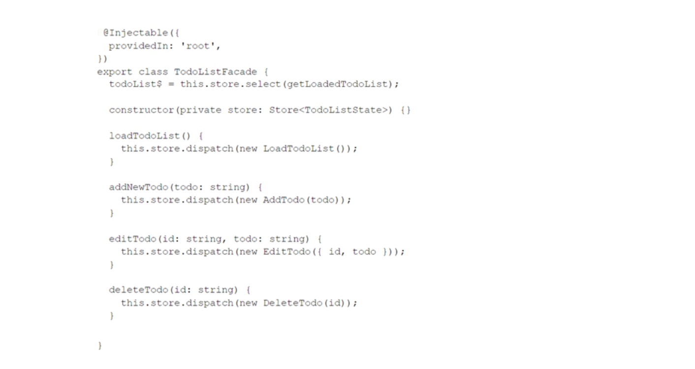 As we go further, we use NgRx more and more, and interactions become more and more complicated. Here the Facade pattern rushes to the rescue. It makes it simple by wrapping NgRx in a dedicated place. It allows only the Component to interact with Facade. Thus, it protects Components and makes the NgRx artifacts refactoring more reliable. (see http://g.co/ng/security#xss)