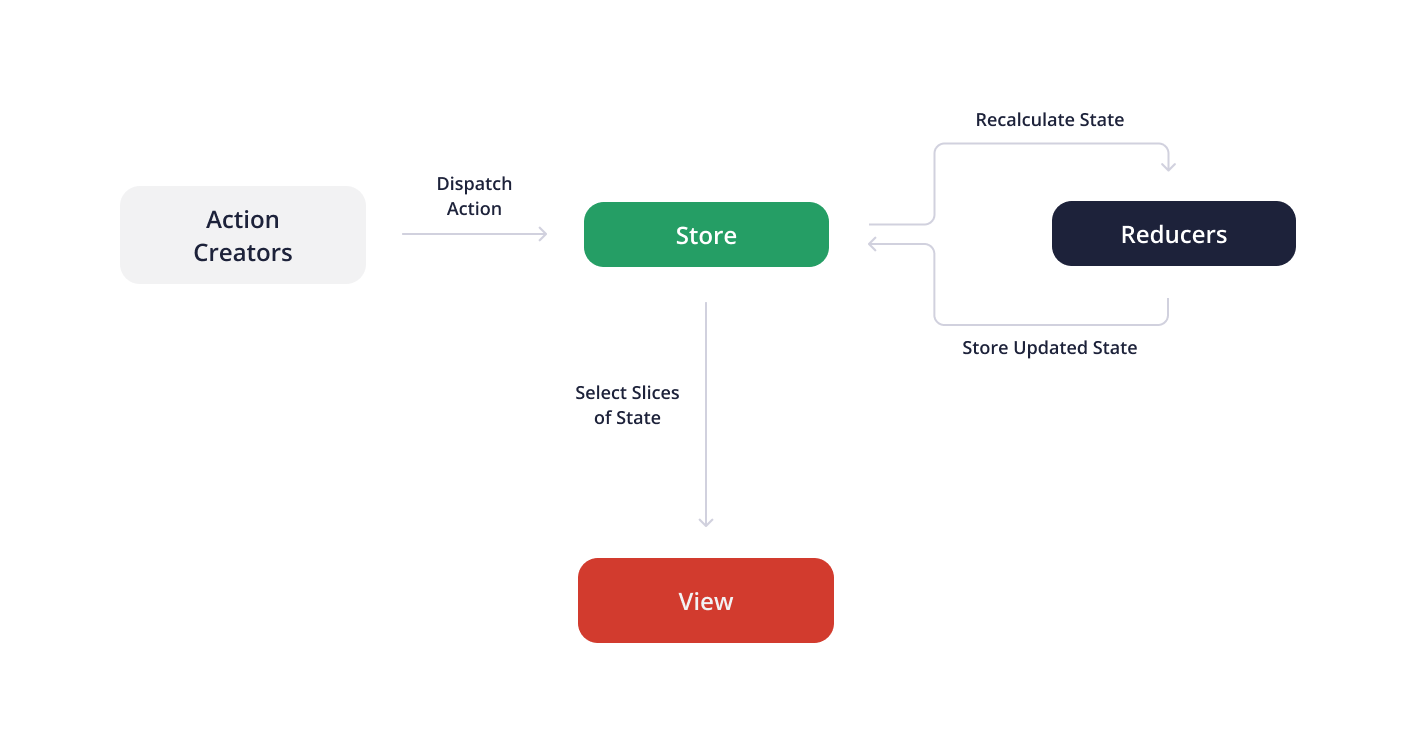 - To recalculate the new state and replace the old one, Store dispatches Actions to Reducers.
